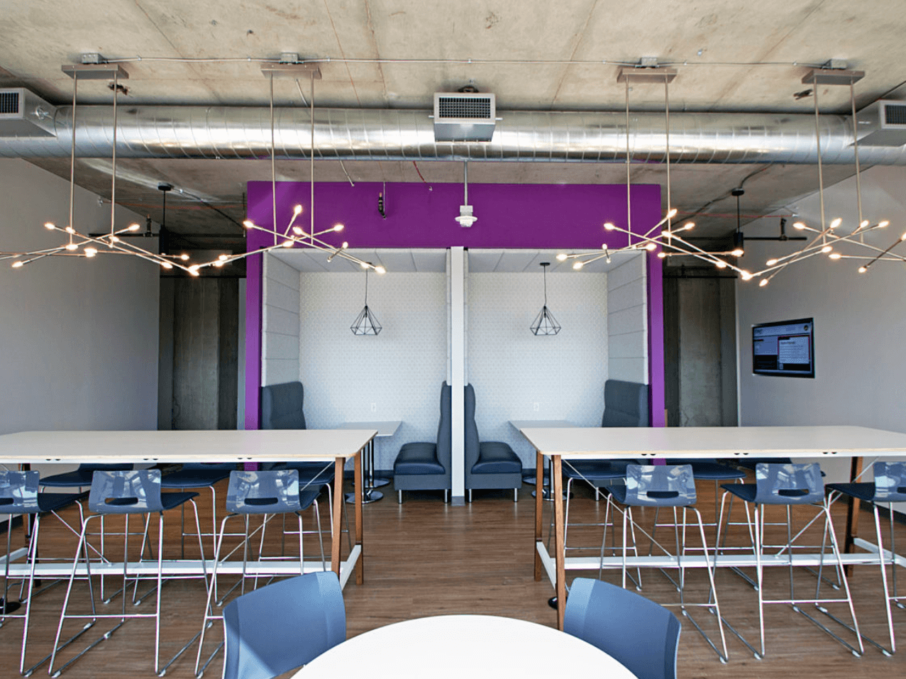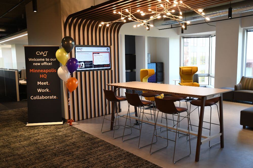 CWT (formerly Carlson Wagonlit Travel) is a travel management company coordinating business travel, meetings, incentives, conferencing, exhibitions, and event management for leading global organizations to “make the world work for you”, their tagline. Having previously worked with CWT in London, Singapore, and Paris the client came to Unispace once again to redesign their global headquarters in Minnesota, but here it would be a much more challenging undertaking. Their existing offices had hardly been changed since 1989 and the 10 floors they occupied had private offices around the perimeter and high paneled workstations throughout. It was not efficient by today’s standards and did not support the way their business works anymore. The client knew they needed to “get with the times” and even had an 80’s themed “demo party” prior to construction starting but, before we could get there, we had a lot of work to do. We started with an extensive strategy effort to determine how much space they needed to maintain and the functions it would serve before design could begin. Our workplace strategy team, in partnership with the design team and a delivery preconstruction specialist, evaluated the exiting building and the current use of the environment. We performed space data analysis, including on site observation, badge swipe readings, meeting space scheduling, and occupancy data to evaluate how people were using the current environment. Our team then engaged in an extensive interview process to get to know the 15 departments within the organization, and its culture. Shaped by our strategy findings and interview outcomes, CWT selected a workplace model that would consolidate its space to 4 floors, reducing its overall square footage drastically while offering many more meeting spaces and amenities. For this to work, we would standardize a kit of parts for the new workstations and create a largely open office environment.