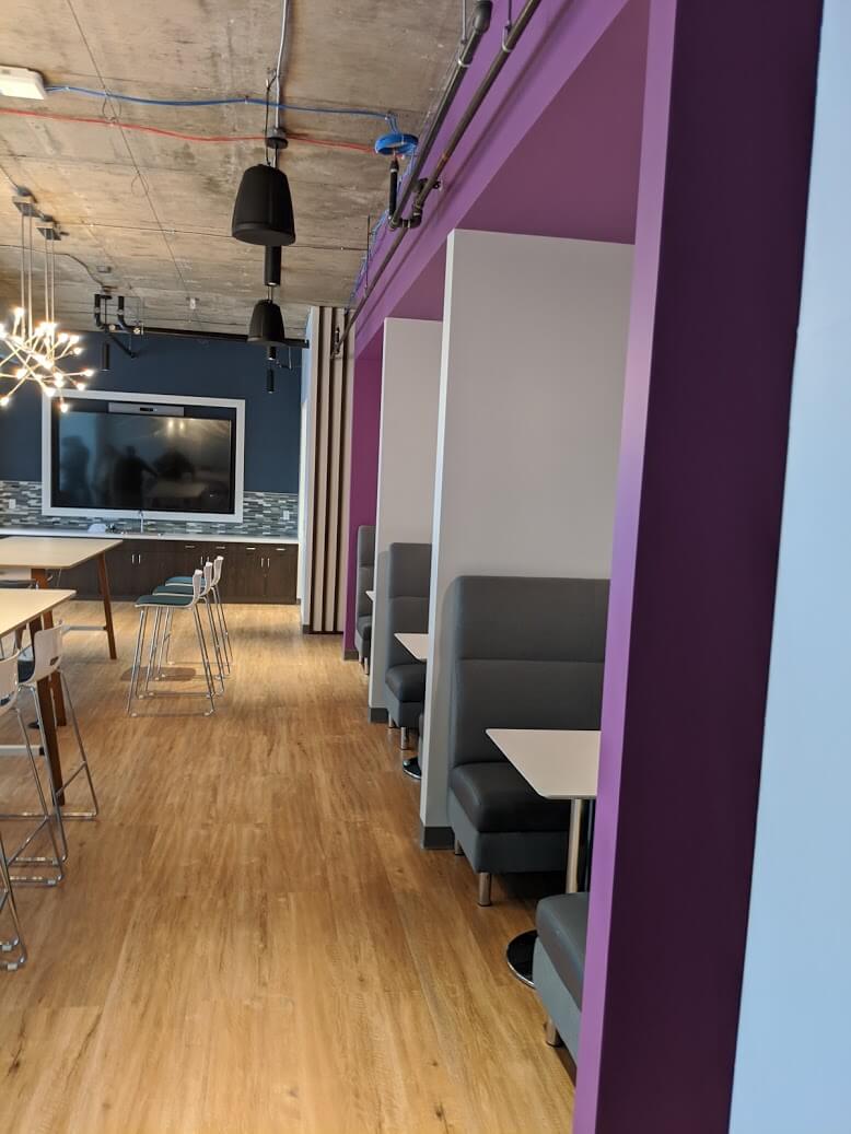 Once strategy development was complete, we engaged with CWT’s internal steering committee to develop and validate a design solution. The program developed informed the size, orientation, and adjacencies that would support their many businesses. As we zeroed in on the final layout, we began to explore the aesthetic goal for their headquarters. The committee made it clear that they wanted this office to “connect” with other offices around the world yet be identifiable for its Midwestern staff members. Little nods, like the cut log side tables and woven fabrics used in the collaboration and lounge spaces refer to the North Woods, while the movable stools that stack in recesses, like Tetris, are a direct specification from their Paris studio. The wood slat ceiling feature above the reception desk, and repeated throughout, is an evolution of a wood accent used in their Bogota space, but here we changed the shape and scale, added a curve at the transition from wall to ceiling, to emulate the smooth glide of a plane as travel is their business. What resulted is an eclectic environment where, “My CWT,” their mantra, is reflected everywhere. Sometimes it is subtle, as in the finish pallet we developed to coordinate with their newest branding guidelines but, to offer a level of sophistication, we created depth with use of additional hues, textures, and patterns. In other area we incorporated more literal branding graphics and digital media. State of the art technology is available everywhere.