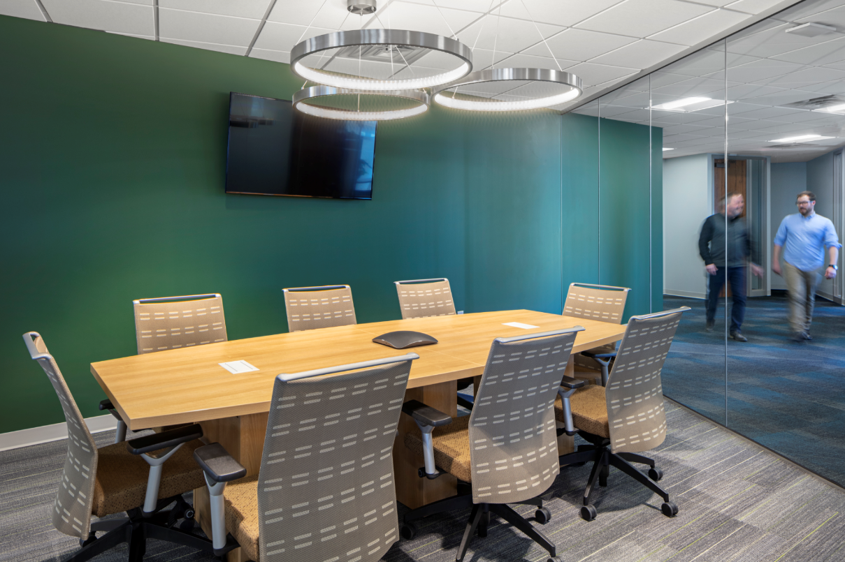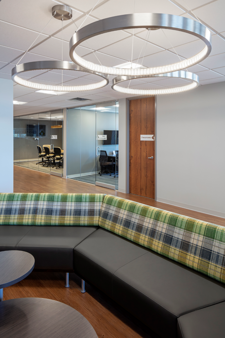The look and feel of the interior were also especially important to the team. They wanted to provide their staff with a space that celebrated their culture, brought teams together, and identified with their market sector of Agriculture. The old place had no spirit for them and said nothing of their culture, plus the small windows brough in little natural light. They wanted to create an environment that not only represented the brand, but also brighten their days. In the new location we utilized the full height glass windows to provide expansive views, with large spans of perimeter glass at the open office area to the West and the break/collaboration space to the East. With these two sides open, and a full-length line of sight from one end to the other, the office feels extremely spacious. The environment we created is truly light and airy, while the finish pallet and adornments provide a nod to their agricultural basis of their company. We implemented earthy tones and reflections of water with our use of color. Rustic wood floors and a couple of plaid fabrics harken to the farmstead, while a dark green wall behind a central conference room pays homage to John Deere tractors. Even the accent light fixtures were selected and placed to give salute to farm implements and the planting process, which is the lifeblood of their business. The result is an office that breaths the brand and elevates the people that work there.