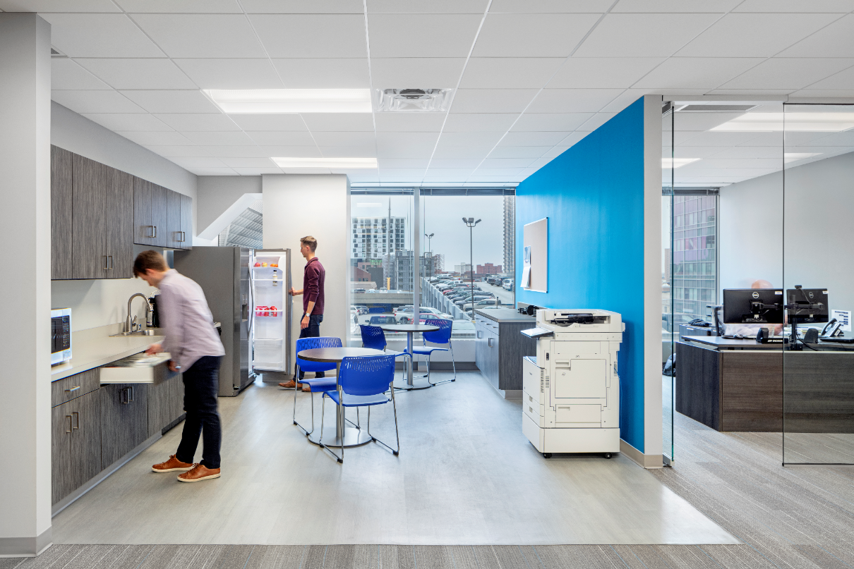 The space we were working with had been vacant for years, and it showed. The ceiling and lighting were dark and dated, while the existing offices only had small sidelights. At one point someone had spent a lot of money on this space, with stone flooring in the halls and tall custom base, trim details, crown molding from a different era. It was hard for our clients to conceive that this suite could be transformed to create the clean and contemporary office they were seeking. We utilized our 3D visualization tools to help the guys understand that we could evolve the space to create the fresh, clean, light and bright, office they envisioned. An environment they would enjoy working in plus help them attract and retain the talent they needed to continue the success of their business.
